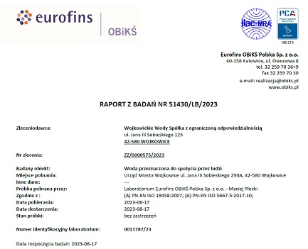 Poniżej przedstawiamy raporty z obowiązkowego, okresowego badania wody przeznaczonej do spożycia w Wojkowicach: