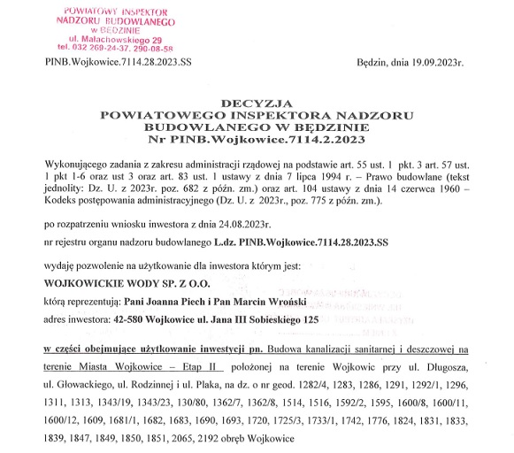 Pozwolenie na użytkowanie nowo wybudowanej sieci kanalizacji sanitarnej