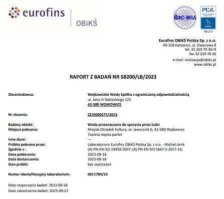 Poniżej przedstawiamy raporty z obowiązkowego, okresowego badania wody przeznaczonej do spożycia w Wojkowicach: