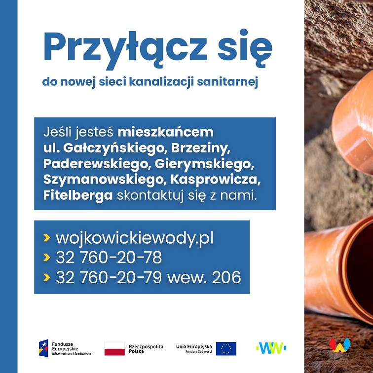 W związku z uzyskaniem kolejnego pozwolenia na użytkowanie nowo wybudowanej sieci kanalizacji sanitarnej na terenie Wojkowic przy ulicach: Gałczyńskiego, Brzeziny, Paderewskiego, Gierymskiego, Szymanowskiego, Kasprowicza, Fitelberga, informujemy, że przyłączenie się do sieci kanalizacji sanitarnej w tych rejonach jest już możliwe.