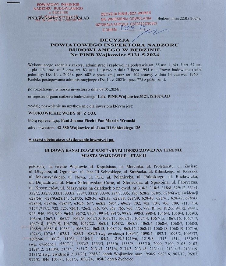 W związku z uzyskaniem kolejnego pozwolenia na użytkowanie nowo wybudowanej sieci kanalizacji sanitarnej na terenie Wojkowic informujemy, że przyłączenie się do sieci kanalizacji sanitarnej w rejonach wymienionych w decyzji jest już możliwe.