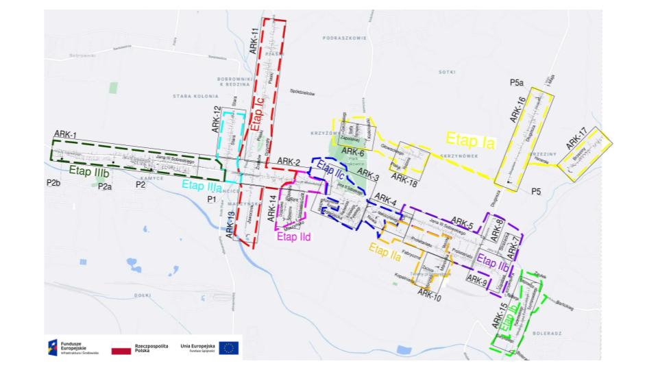 Etap I (ulice: Brzeziny, Długosza, Głowackiego, Rodzinna, Plaka, Zapolskiej, Gałczyńskiego, Staffa, Tetmajera, Fitelberga, Gierymskiego, Kasprowicza, Paderewskiego, Szymanowskiego, Jaworznik, Źrałków, Piaski oraz częściowo ulica Jana III Sobieskiego) – do 31 sierpnia 2023 r.