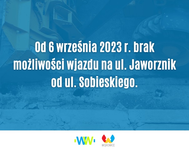 Informujemy, że w związku z prowadzeniem robót budowlanych kanalizacji od dnia 6 września 2023 r. część ulicy Jaworznik od skrzyżowania z ulicą Jana III Sobieskiego będzie zamknięta.