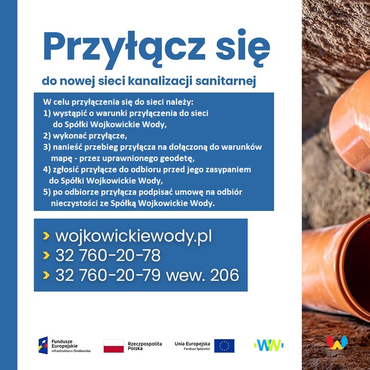 Read moreW związku z realizacją projektu pn. „Budowa kanalizacji sanitarnej i deszczowej na terenie Miasta Wojkowice - Etap II” informujemy, że przyłączenie się do nowo wybudowanej kanalizacji sanitarnej jest możliwe dla całego zakresu projektu tj. ulic: Jana III Sobieskiego, Piaski, Jaworznik, Źrałków, Skłodowskiej–Curie, Spokojnej, Dojazdowej, Drzymały, Proletariatu, Kilińskiego, Pułaskiego, Nowej, Tetmajera, Staffa, Gałczyńskiego, Głowackiego, Długosza, Brzeziny, Strażackiej, Paderewskiego, Morcinka, Połanieckiej, Racławickiej, Akacjowej, Zapolskiej, Rodzinnej i ich sąsiedztwie. Zgodnie z art. 5 ustawy o utrzymaniu czystości i porządku w gminach (t.j. Dz. U. z 2023 r., poz. 1469) przyłączenie się do funkcjonującej sieci kanalizacyjnej na terenie miasta jest obowiązkowe.