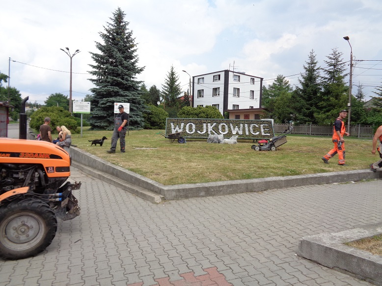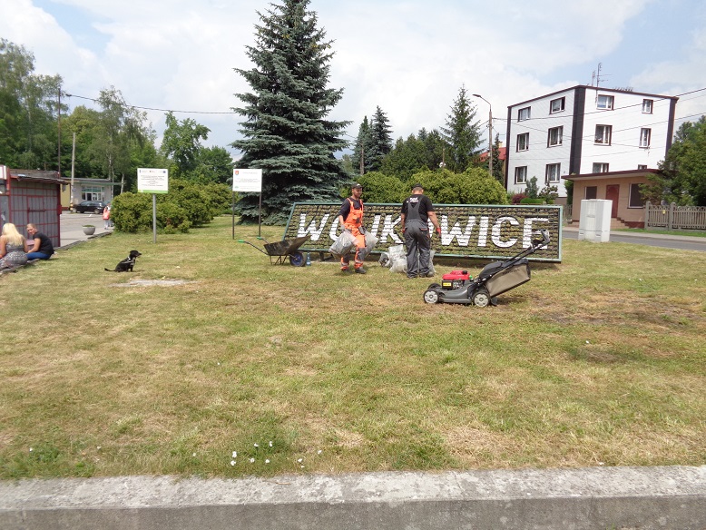 Pracownicy Zakładu Gospodarki Komunalnej w Wojkowicach uzupełnili napis "Wojkowice" w umieszczonej w zeszłym roku, w centrum miasta, konstrukcji reklamowej.